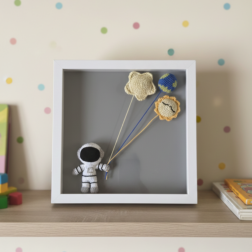 Cuadros decorativos con amigurumis tejidos a mano, diseñados para conservarse perfectos con el paso del tiempo. Cada amigurumi va protegido dentro del cuadro, evitando que se llene de polvo o se estropee.